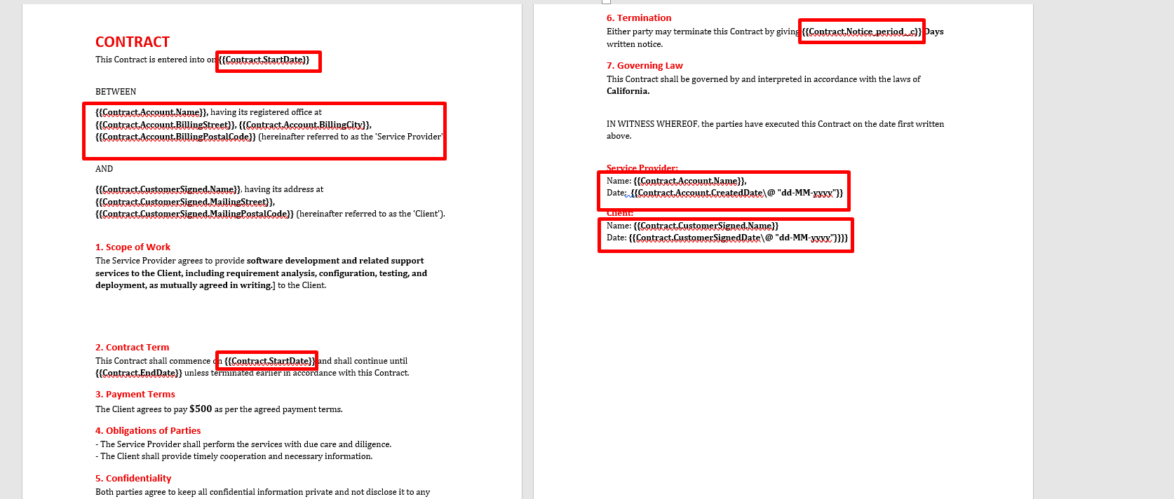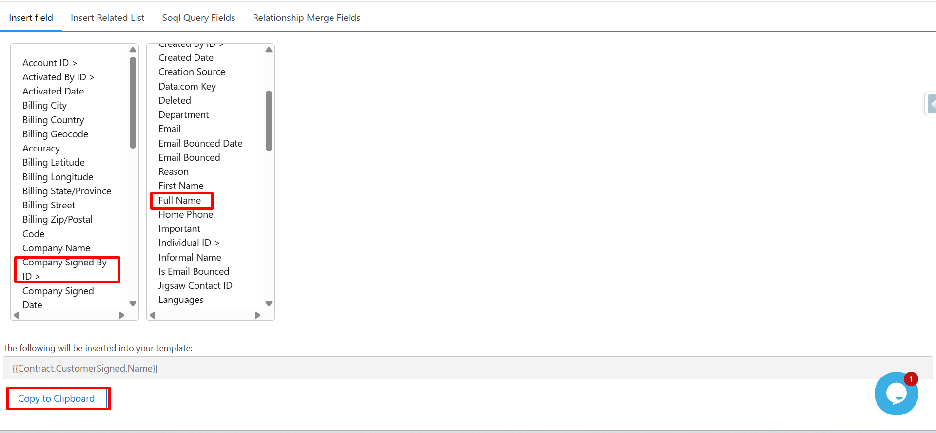 The syntax appears: {{Contract.CustomerSigned.Name}}.