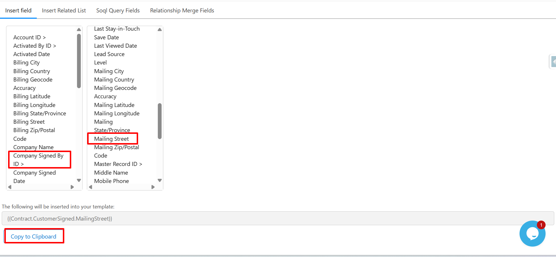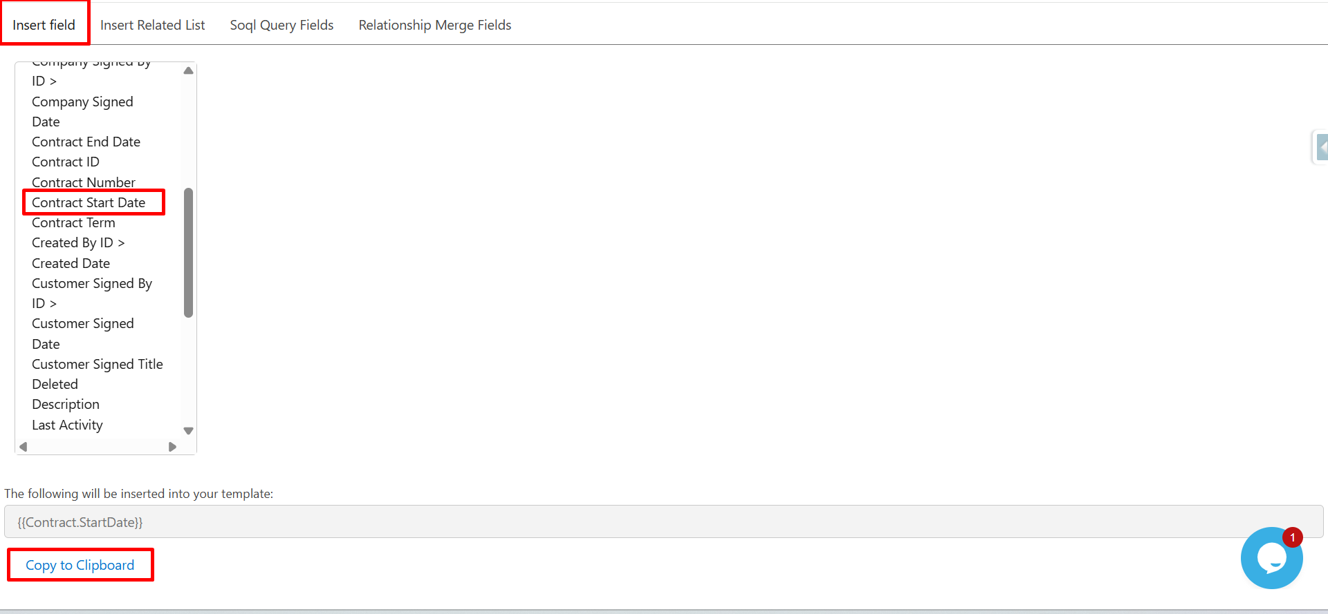 The system will auto-generate the merge field syntax: {{Contract.StartDate}}