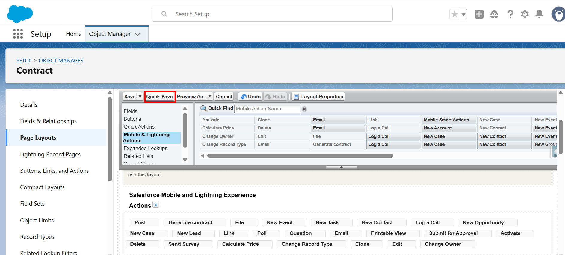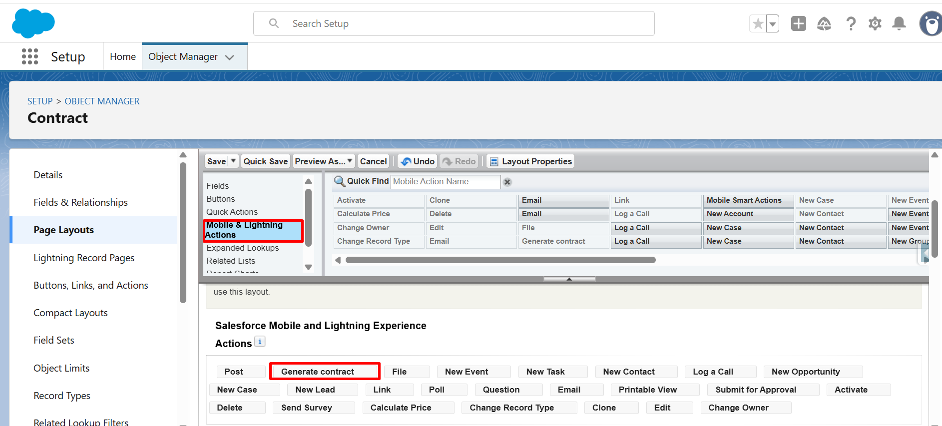 Step 19: From Mobile & Lightning Actions, drag and drop the Generate Contract button into Salesforce Mobile and Lightning Experience Actions.
