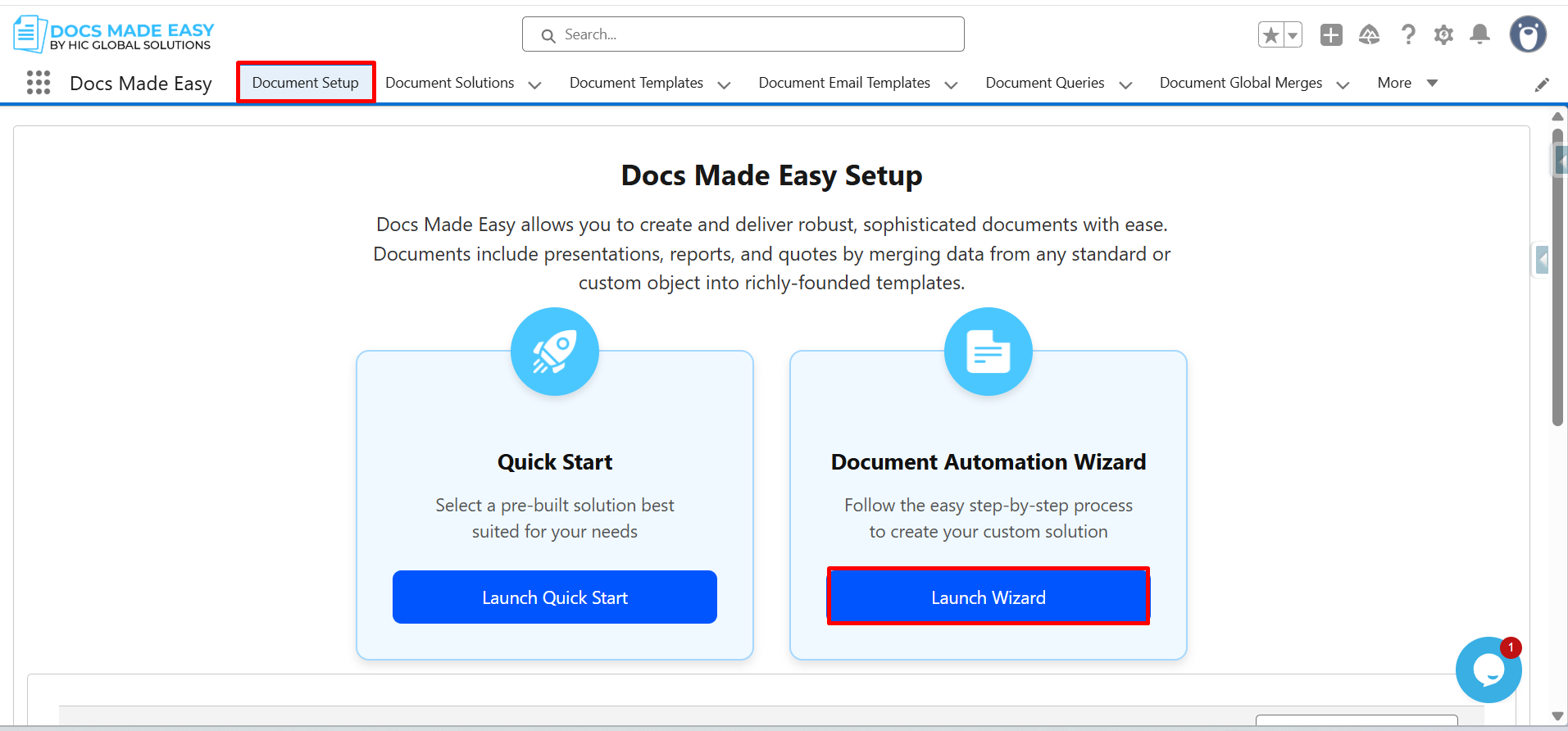 Step 3: Click on Document setup, then click Launch wizard.