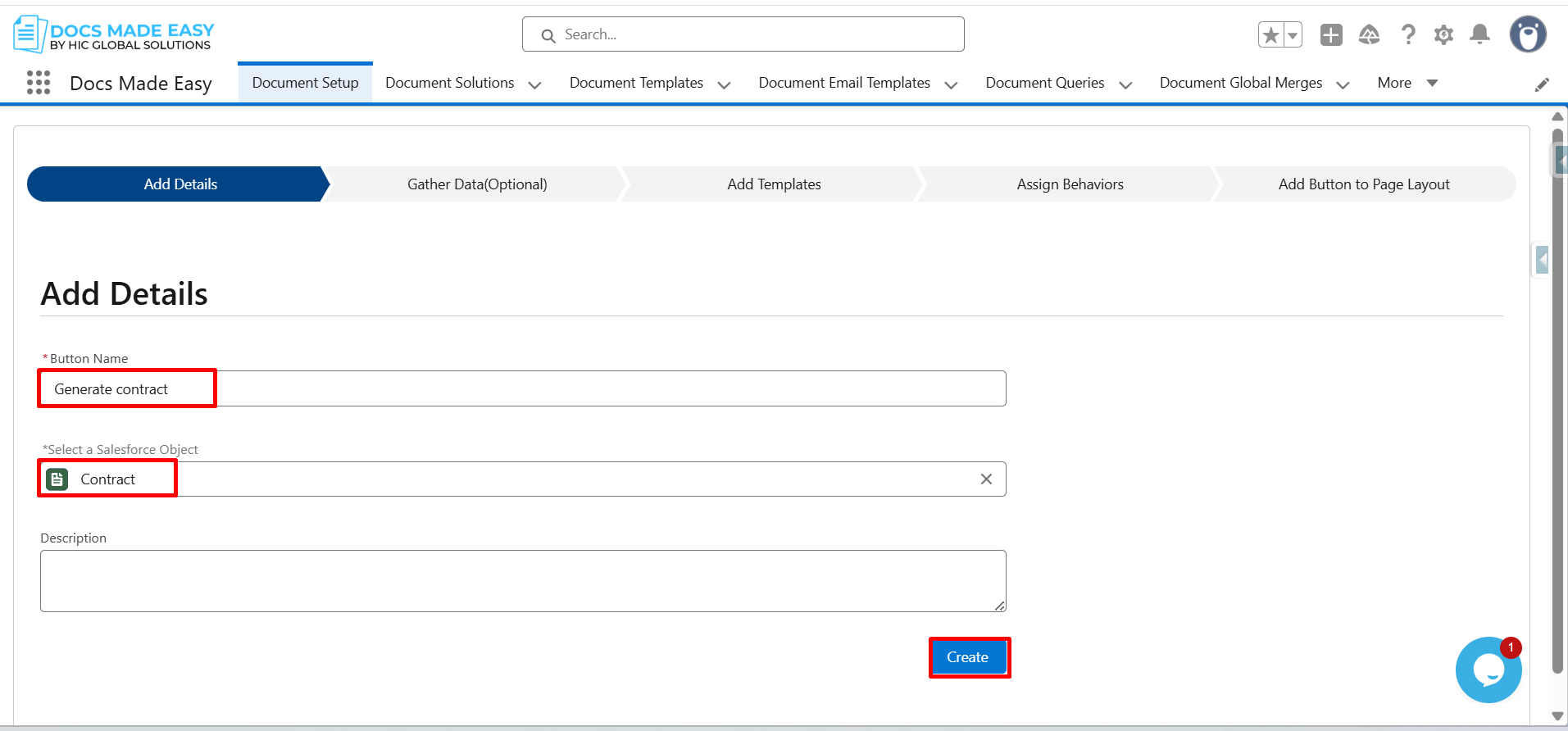 Step 4: Enter the Button Name, select the Salesforce Object (Contract), and click Create.
