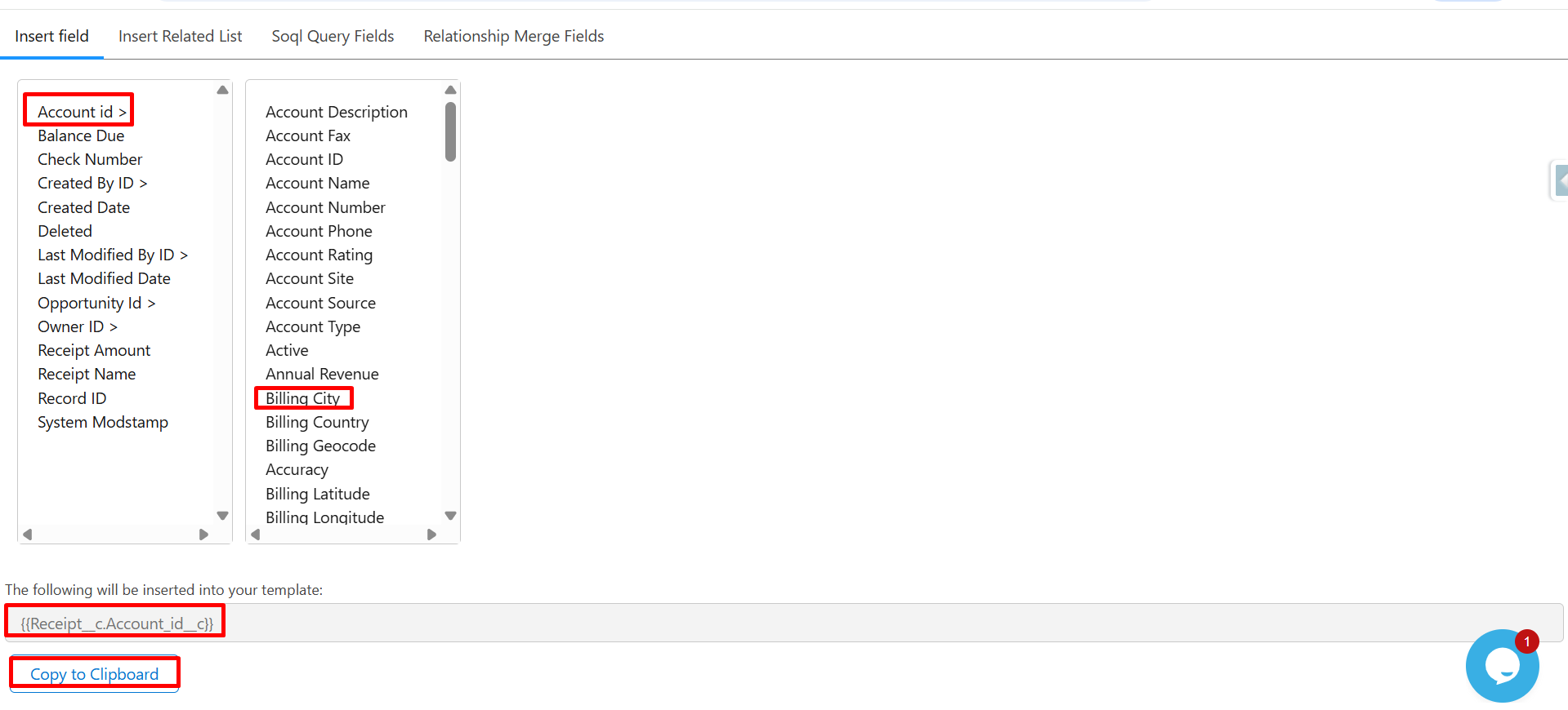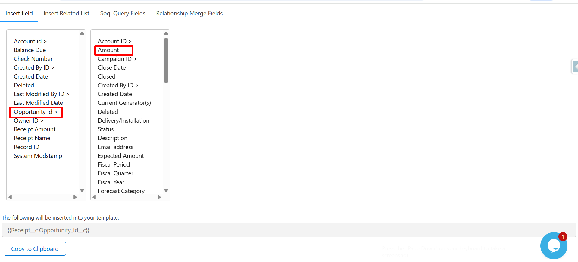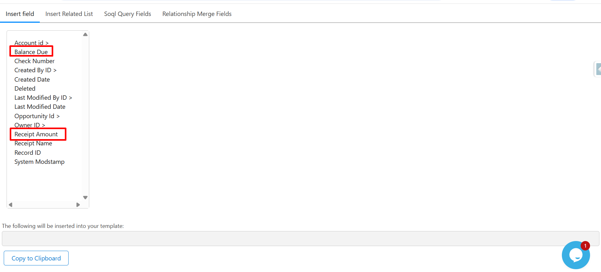 Step 11: Click on Balance Due and Receipt Amount, and then click Copy to Clipboard to copy their merge syntax.
