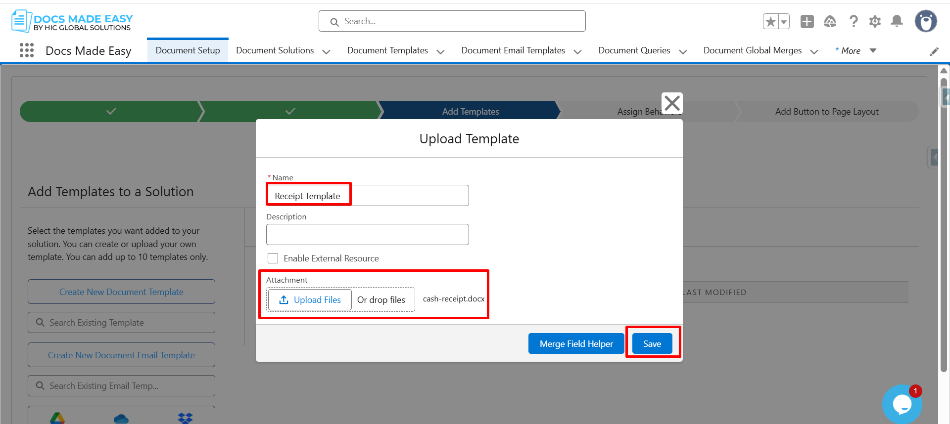 Step 13: Reopen the Upload Template window, enter the Template Name, upload the template file, and click Save.