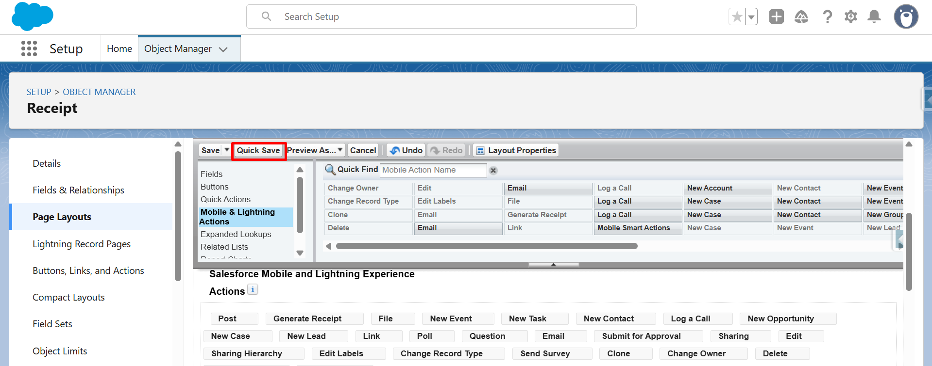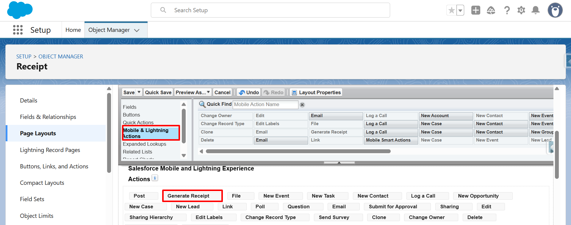 Step 18: From Mobile & Lightning Actions, drag and drop the Generate Receipt button into the Salesforce Mobile and Lightning Experience Actions section.