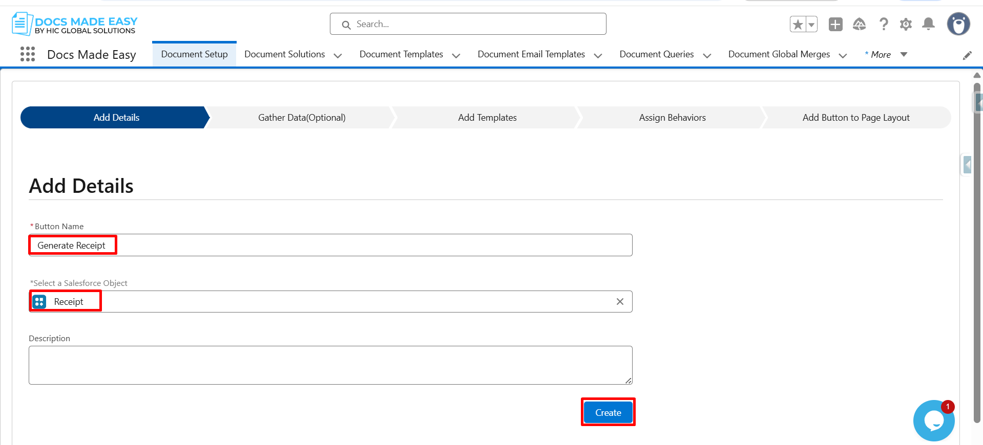 Step 4: Enter the Button Name, select the Salesforce object (Receipt), and click on Create.