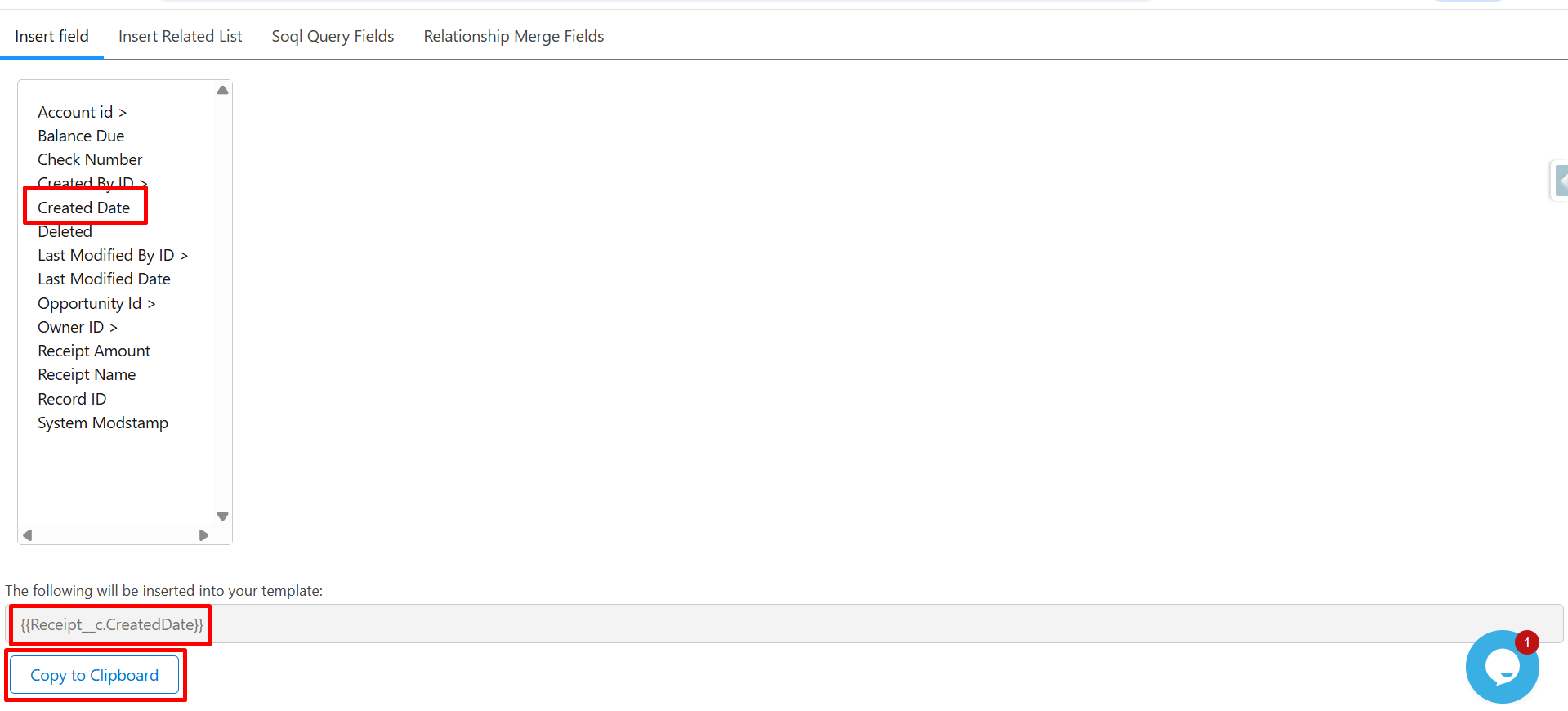 Step 8: Click on Insert Field, select Created Date, and then click Copy to Clipboard to copy the merge field {{Receipt__c.CreatedDate}}.