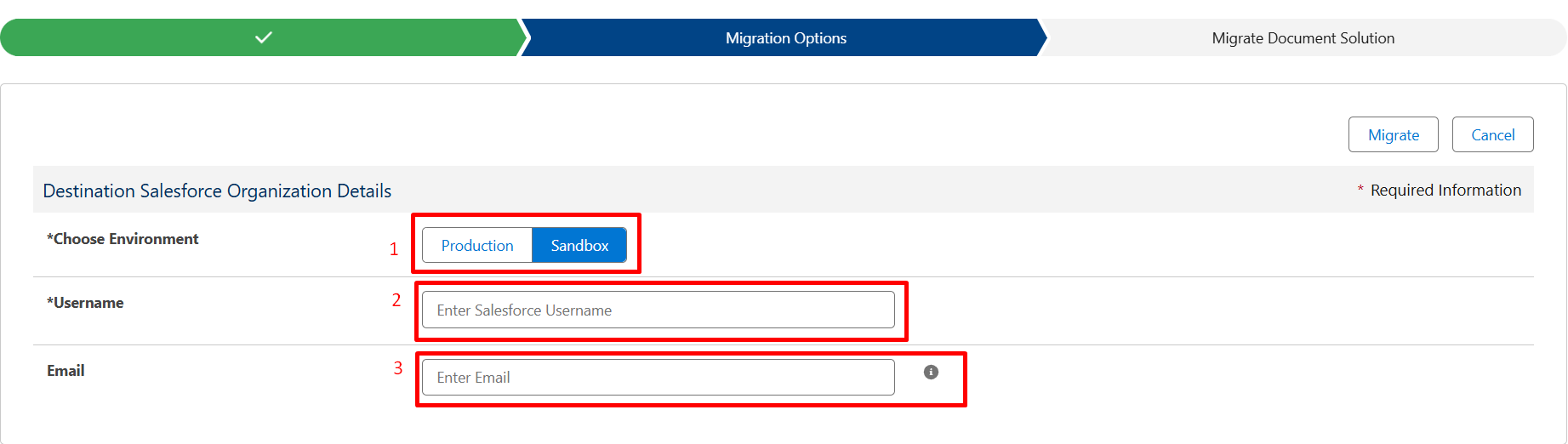 Step 12: Now, in the Final Setup section, choose the “Environment” where you want to migrate your document solution. Furthermore, enter the “Username” of the target org where the migration should take place.
