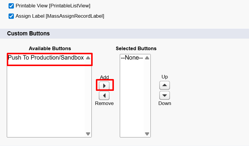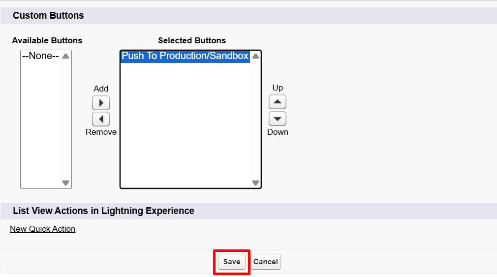 Step 6: Proceed further by selecting “Push to Production/Sandbox” from Custom Buttons and move it to the Selected Buttons section so it becomes visible in the list view.